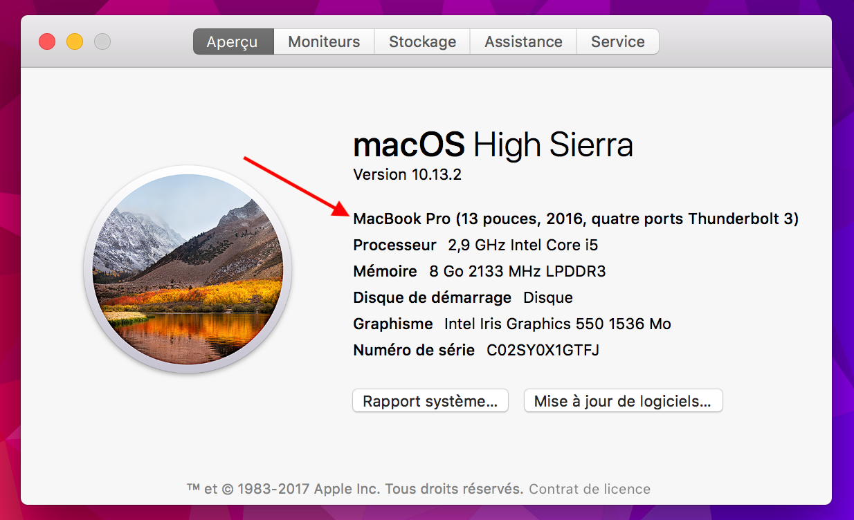 Dans le premier onglet Aperçu, vous aurez en premier le nom de votre macOS et la version en dessous. La première ligne du second paragraphe contient le modèle exact de votre Mac.