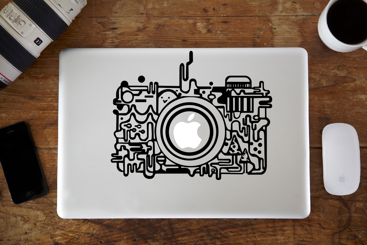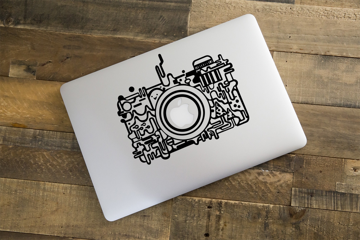 Magnifique stickers Appareil Photo fun pour MacBook Pro ou Air. Ce stickers pour Mac représente un appareil photo stylisé noir ou blanc.